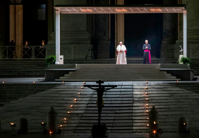 Na nabożeństwo transmitowane przez watykańskie media na cały świat przyniesiono krzyż Świętego Marcelego z jednego z rzymskich kościołów. Krucyfiks, przed którym już kilka razy modlił się Franciszek, noszono przez Wieczne Miasto w procesjach w XVI wieku w czasie zarazy.