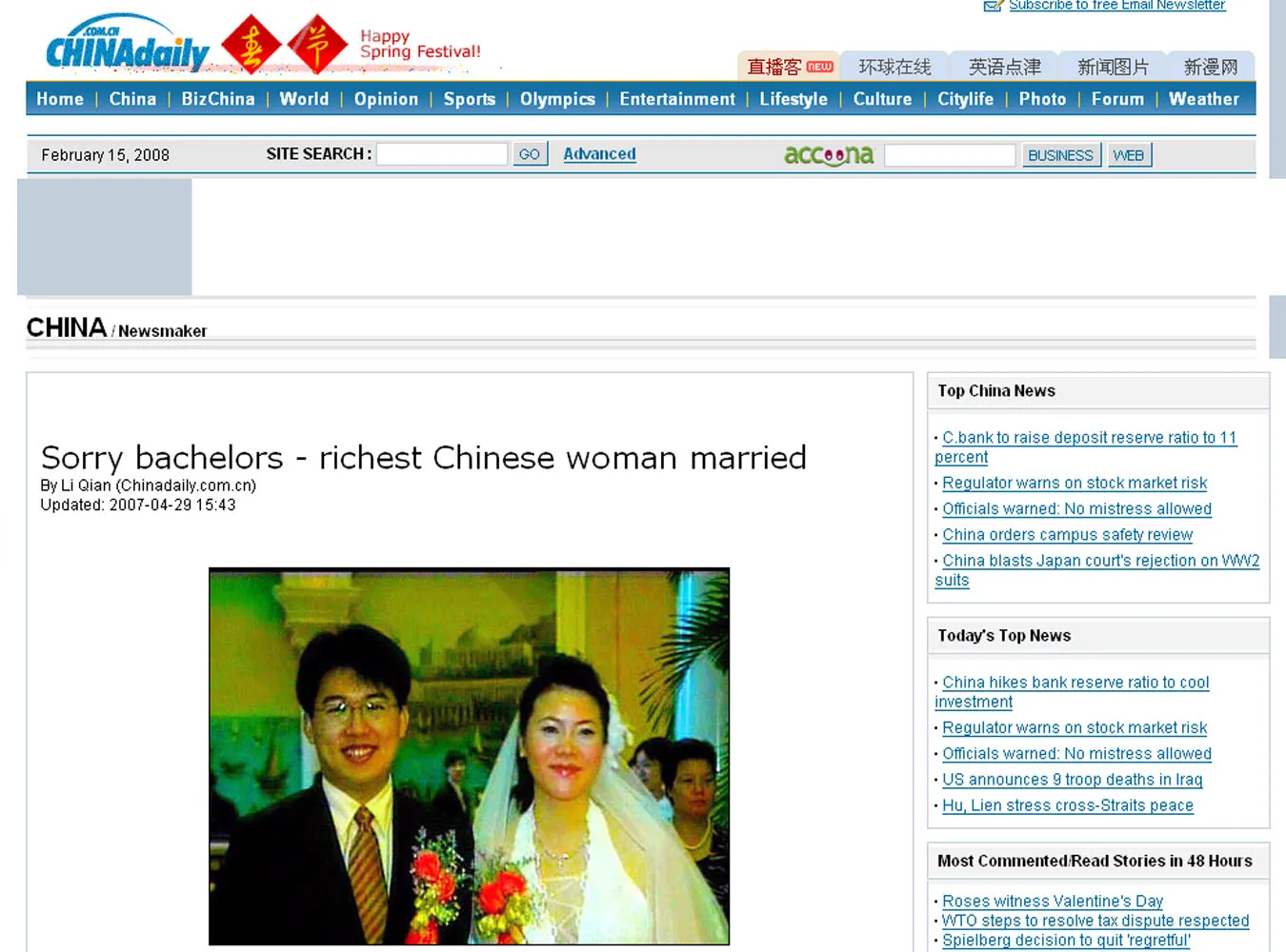 Aż do grudnia 2008 roku królować będzie chińska piękność. Została wybrana Miss Świata podczas konkursu zorganizowanego po raz pierwszy w stolicy Chin w grudniu 2007 roku.