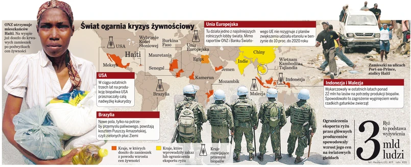 Według najnowszego raportu Banku Światowego wzrost produkcji biopaliw zmniejsza ilość zbóż dostępną na światowych rynkach, co przekłada się na rosnące ceny żywności. BŚ ostrzega, że już wkrótce z tego powodu głód zajrzy w oczy nawet 100 mln ludzi na całym świecie. Na Haiti już doszło do rozruchów, bo ceny żywności drastycznie wzrosły.