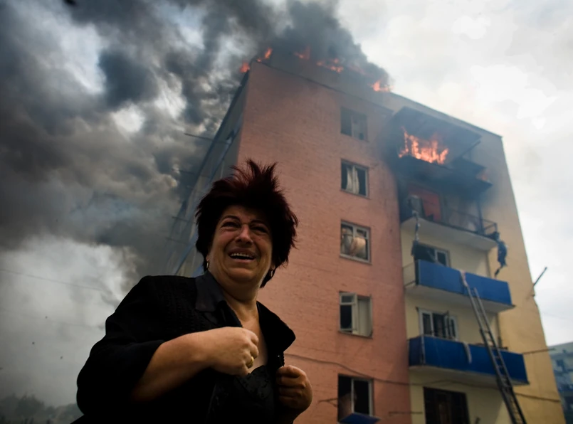 Zajeżdżamy na ulicę Suchiszwili. Górne piętra domów płoną. Dookoła biegają żołnierze, lekarze, krewni i znajomi mieszkańców, dziennikarze. Grupka gapiów po przeciwnej stronie ulicy z przerażeniem patrzy to na buchający z okien ogień, to na wynoszone z budynków ofiary. 17 zabitych i ponad 260 rannych - takie liczby poda później szpital w Gori. Karetki kursują jak szalone. Lżej ranni przewożeni są miejskimi autobusami - to główny gruziński środek transportu w tej wojnie.