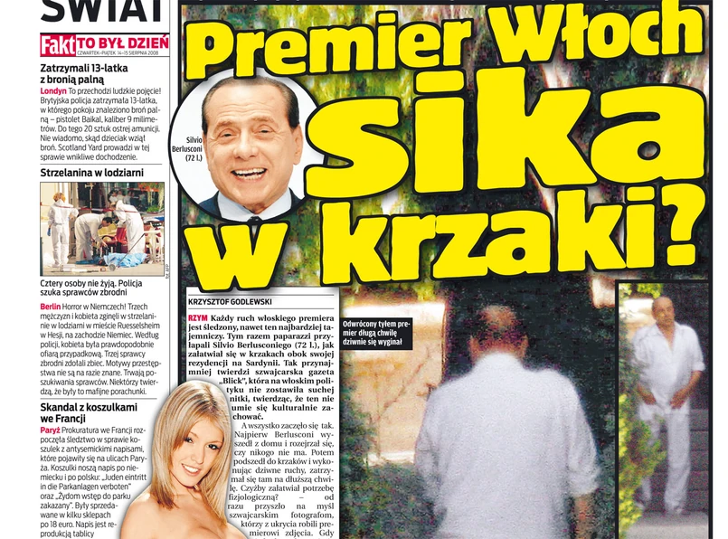 Każdy ruch włoskiego premiera jest śledzony, nawet ten najbardziej tajemniczy. Tym razem paparazzi przyłapali Silvio Berlusconiego jak załatwiał się w krzakach obok swojej rezydencji na Sardynii. Tak przynajmniej twierdzi niemiecka gazeta "Blick", która na polityku nie zostawiła suchej nitki - pisze "Fakt".