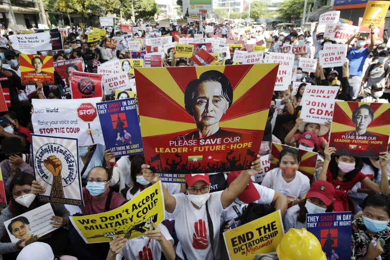Uczestnicy akcji protestacyjnych domagają się przywrócenia obalonego rządu Narodowej Ligi na rzecz Demokracji (NLD) i uwolnienia jej przywódczyni, laureatki Pokojowej Nagrody Nobla Aung San Suu Kyi, aresztowanej przez wojsko. (