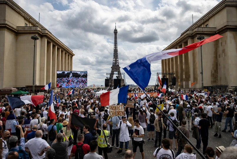 Na Placu Trocadero niedaleko wieży Eiffla na wezwanie Floriana Philippota, polityka skrajnej prawicy, byłej prawej ręki Marine Le Pen, zgromadziły się setki osób. Jest was tysiące - powiedział Philippot, jeden z głównych organizatorów sobotnich oraz zeszłotygodniowych protestów, który jest przeciwny paszportom sanitarnym i wzywa do bojkotu obowiązku ich posiadania.