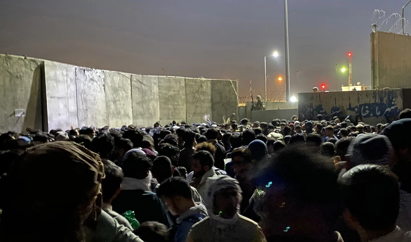 Przed lotniskiem w Kabulu mimo zamkniętych bram stoją tłumy ludzi, chcących wydostać się z Afganistanu po dojściu talibów do władzy.