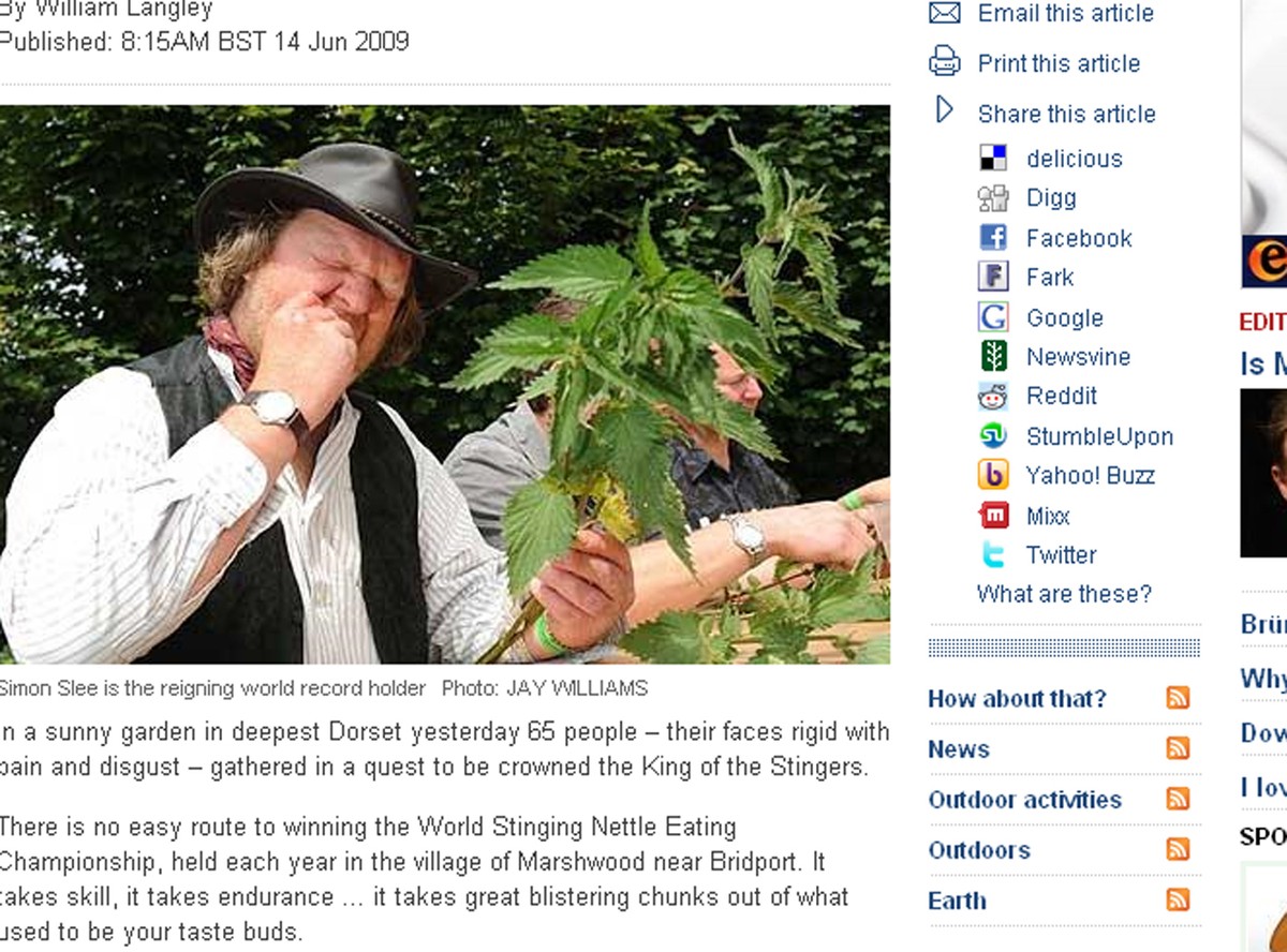 Nietypowa impreza odbywa się co rok od ponad dwóch dekad. Uczestnicy mistrzostw mają godzinę, by zjeść jak najwięcej parzących liści. Najpopularniejsza technika to zrolowanie pokrzyw w male kulki i próba połknięcia ich bez kontatku z wnętrzem jamy ustnej. Ten zabieg nie zawsze się jednak udaje, i potrafi skończyć się bolesnymi ranami.