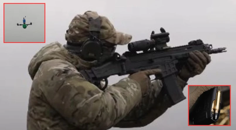 Wygląda jak amunicja do karabinu w standardzie NATO. Ale jest to najpewniej nabój wielopociskowy – po wystrzeleniu rozpada się w powietrzu na kilka fragmentów, wielokrotnie zwiększając prawdopodobieństwo trafienia drona. Dzięki czemu żołnierz ma większe szanse się obronić przed atakującym go bezzałogowcem.