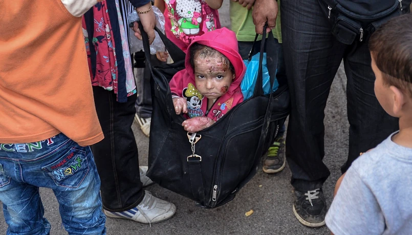 Pokiereszowane dziecko imigrantów w torbie podróżnej. Fotograf: Widok trudny do wytrzymania