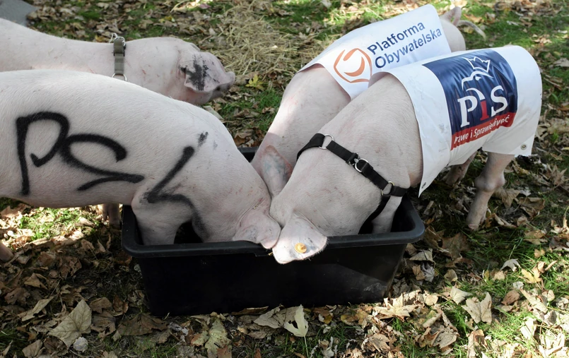 Cztery prosiaki zostały przywiezione na Wiejską. Był to element happeningu komitetu wyborczego KORWiN, który nawiązując do parlamentarzystów, chce - jak mówią jego przedstawiciele - "odsunąć świnie od koryta".