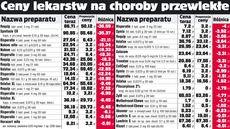 Pozostałe 40 to specyfiki dla osób przewlekle chorych na takie schorzenia, jak choroba Parkinsona, padaczka, astma, jaskra, upośledzenia psychiczne lub umysłowa. Ich ceny spadną do kilku złotych. Do projektu nowej listy można zgłaszać uwagi. Jeśli wszystko pójdzie dobrze, to jeszcze w maju minister zdrowia chce rozporządzenie podpisać. W efekcie nowe niższe ceny zaczęłyby obowiązywać już na początku lipca.