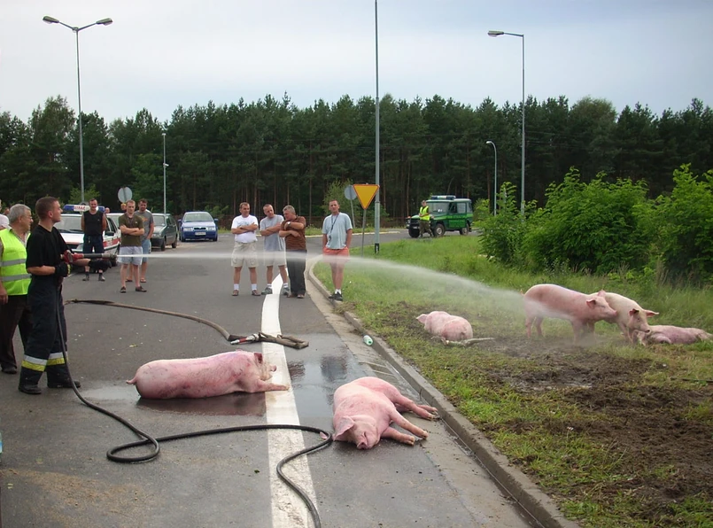"Kiedy przybył transport zastępczy, okazało sie, że dwie maciory zniknęły" - mówi rzecznik prasowy Komendy Powiatowej Straży Pożarnej w Żarach Paweł Hryniewicz. Już po zakończeniu akcji ratowniczej i po tym, jak świnie ruszyły w dalszą drogę, miejscowi chłopi postanowili znaleźć brakujące sztuki, ale po Bercie i Grecie, jak nazwano rezolutne świnki, nie było nawet śladu.