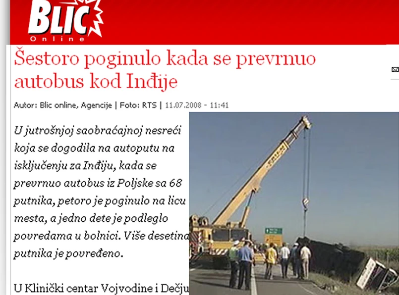 Autobus zahaczył kołami o pobocze, kierowca próbował wrócić na jezdnię, ale się nie udało. "Prawdopodobnie jechał ponad 100 km/h" - mówią przedstawiciel serbskich władz. Piętrowy, czterometrowy neoplan przez 30 metrów siłą rozpędu sunął po trawie. Siła uderzenia 25-tonowego kolosa o ziemię była ogromna. Tylna, prawa część karoserii na górnym pokładzie niemal przestała istnieć.