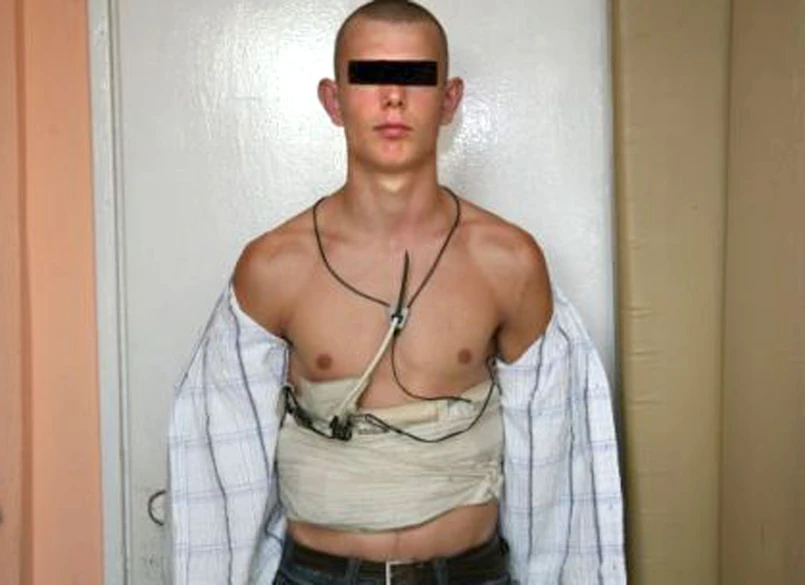 W komendzie mężczyzna zaprezentował swój rynsztunek. Kiedy zdjął bluzę, okazało się, że kabelkami jest oplątany jak mucha, która wpadła do pajęczej sieci.
