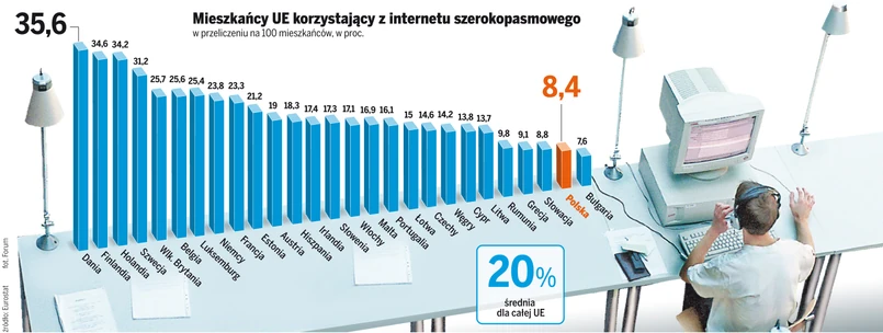 Najgorsza sytuacja panuje na terenach wiejskich, gdzie dostępu do szerokopasmowych łączy nie ma blisko 60 proc. ludności. O problemie tym pisaliśmy już wielokrotnie w DZIENNIKU, przestrzegając, że grozi to zapaścią cywilizacyjną. Dla porównania w najlepiej zinternetyzowanych Belgii i Danii, dostęp do sieci ma 100 proc. mieszkańców. Nie oznacza to, że wszyscy Belgowie i Duńczycy z niej korzystają, ale że każdy obywatel tych krajów ma możliwość podłączenia się do internetu szerokopasmowego. Tymczasem w Polsce korzysta z niej tylko nieco ponad osiem procent mieszkańców. Pod tym względem też jesteśmy na końcu stawki. Gorszy wynik, z odsetkiem 7,4 proc., ma pod tym względem jedynie Bułgaria. "Kraje Zachodu walczą z problemem od początku lat 90., a u nas zainteresowano się się tym ledwie dwa lata temu" - mówi DZIENNIKOWI rzecznik Urzędu Komunikacji Elektronicznej Jacek Strzałkowski.