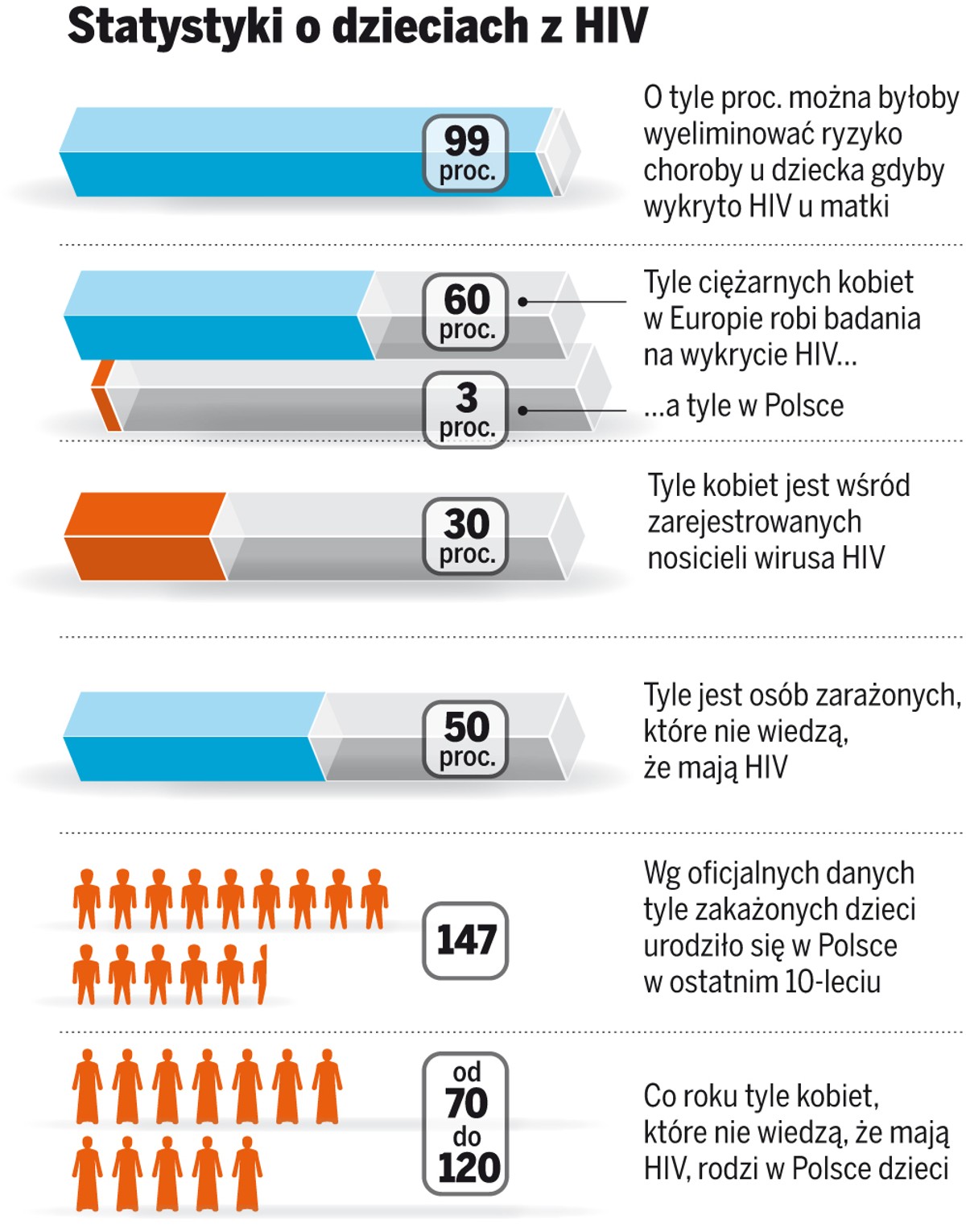 Stowarzyszenie "Mały Książę" zajmujące się dziećmi zakażonymi HIV szacuje, że w Polsce może ich żyć nawet pół tysiąca. Polskie Towarzystwo Ginekologiczne oblicza z kolei, że w ciągu roku w Polsce rodzi od 70 do 120 kobiet z wirusem HIV. "Ponieważ ryzyko zakażenia dziecka w czasie porodu wynosi 30 proc., należy przyjąć, że co roku przychodzi u nas na świat co najmniej 40 nosicieli wirusa" - mówi prof. Tomasz Niemiec z Instytutu Matki i Dziecka, wiceprezes PTG. Gdyby ich matki wśród wielu innych rutynowych badań wykonywanych w czasie ciąży zrobiły również test na HIV, 98 proc. z tych dzieci mogłoby być zdrowych.