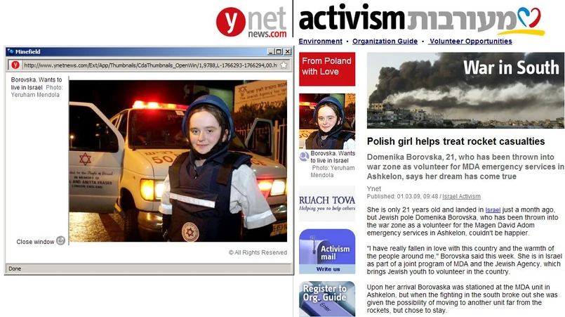 Jak znalazła się u progu wojny Żydów z Palestyńczykami? Jest wolontariuszką projektu Agencji Żydowskiej oraz Magen David Adom (MDA), czyli organizacji humanitarnej Czerwona Tarcza Dawida zrzeszonej w Międzynarodowym Ruchu Czerwonego Krzyża i Czerwonego Półksiężyca.