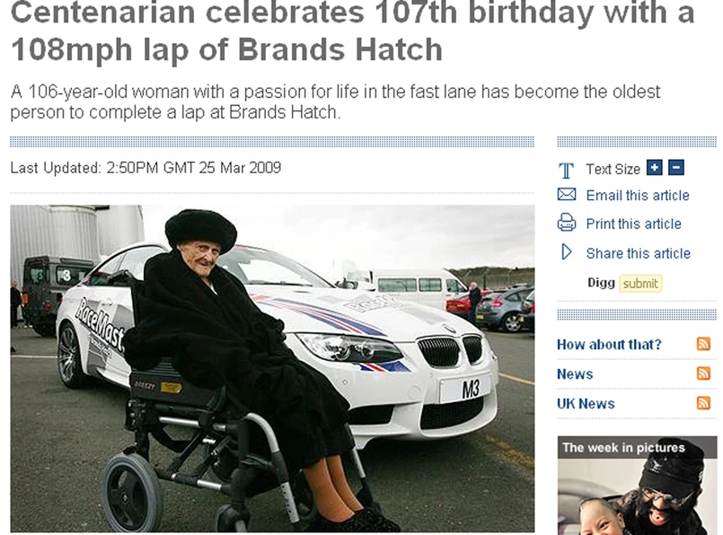 Brytyjka wsiadła do bmw M3 jadącego z prędkością 174 km/h jako współpasażer. Kiedy jazda się skończyła, starsza pani tylko się uśmiechnęła i powiedziała, że kierowca mógł jechać ciut szybciej.
