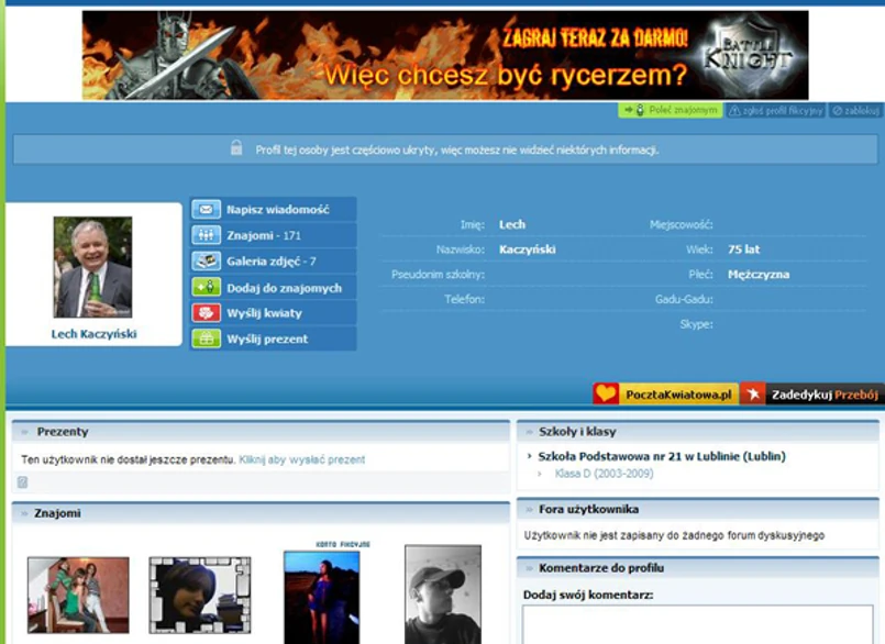 Lech Kaczyński ma aż 64 profile na Naszej-klasie. Wszystkie są fikcyjne. Na wszystkich prezydent jest obrażany. Autorami najgorszych wyzwisk pod adresem głowy państwa są internauci podpisani z imienia i nazwiska.