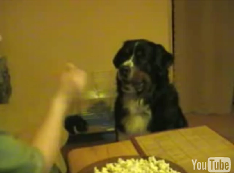 Młoda kobieta podaje psu popcorn, przy każdym kawałku mówiąc kolejne nazwiska: "od Kwaśniewskiego", "od Dody", "od Janusza Palikota". Pies zajada, aż mu się uszy trzęsą. Waha się dopiero na nazwisko "Kaczyński". Nie przekonuje się ani na imię Jarosław, ani Lech.