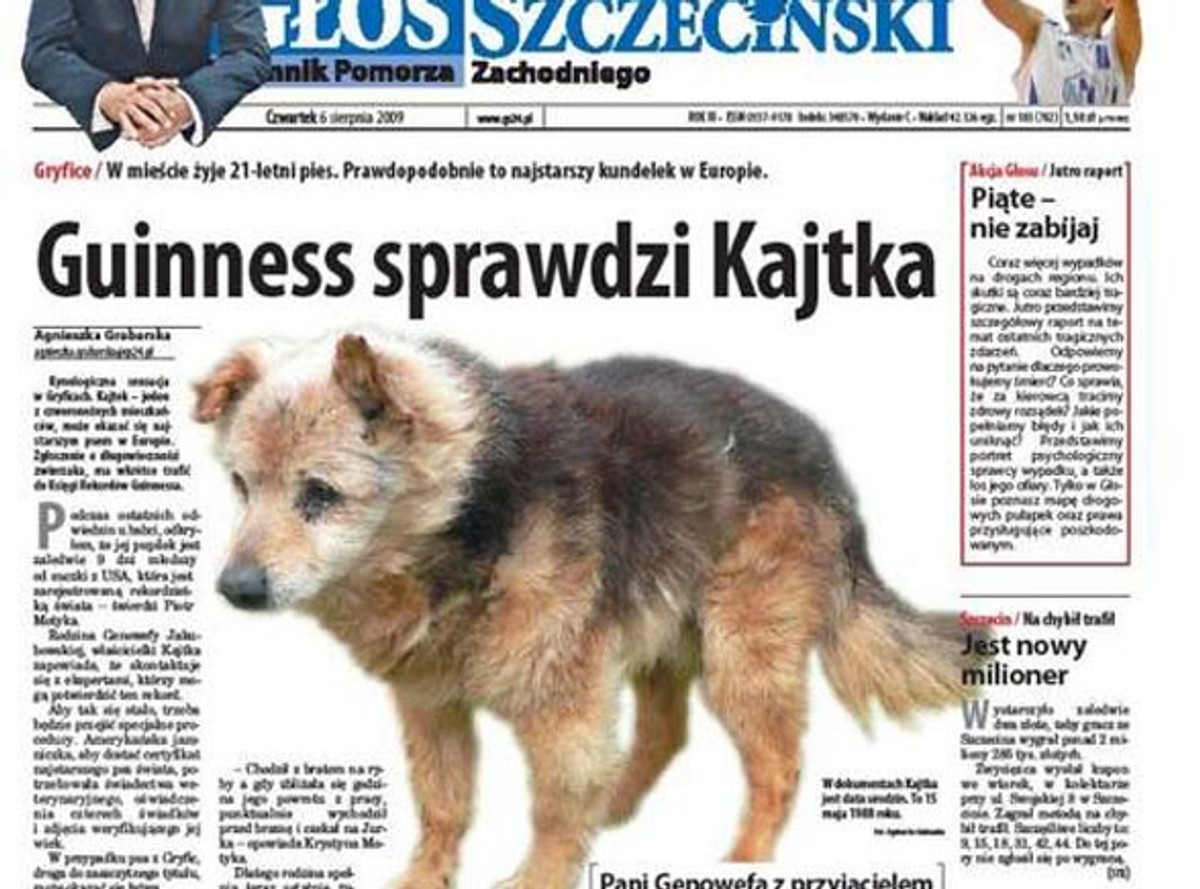 Kajtek to pies pani Genowefy z Gryfic. W jego dokumentach widnieje data urodzin - 15 maja 1988 roku. Piotr Motyka, wnuk pani Genowefy niedawno odkrył, że Kajtek jest tylko o dziewięć dni młodszy od suczki ze Stanów Zjednoczonych, która jest najstarszym na świecie psem zarejestrowanym w Księdze Rekordów Guinnessa.