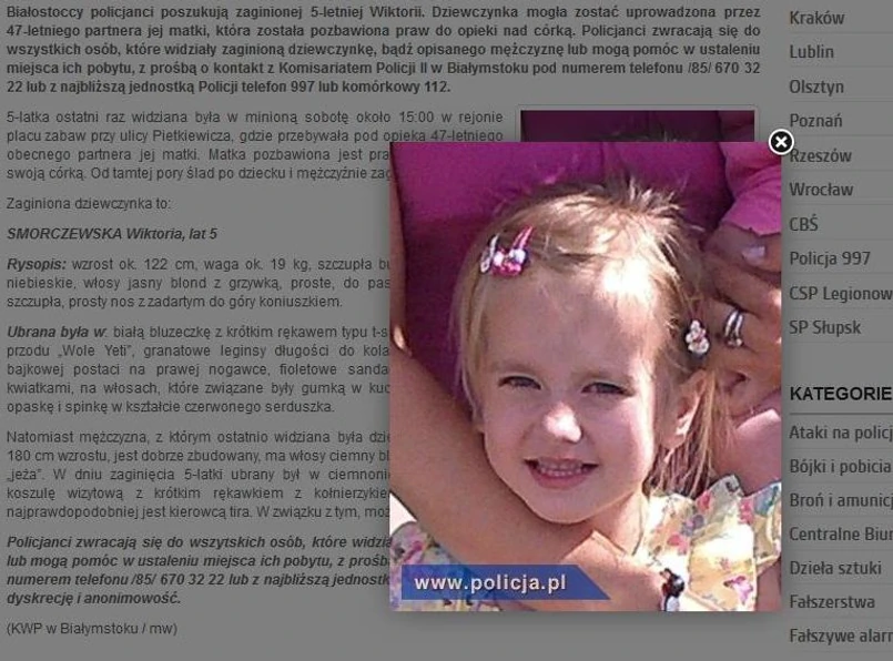 Wiktora Smorczewska ma pięć lat. Ostatni raz widziana była w sobotę, na placu zabaw przy ulicy Pietkiewicza w Białymstoku, około godziny 15. Opiekował się nią tam 47-letni partner jej matki.