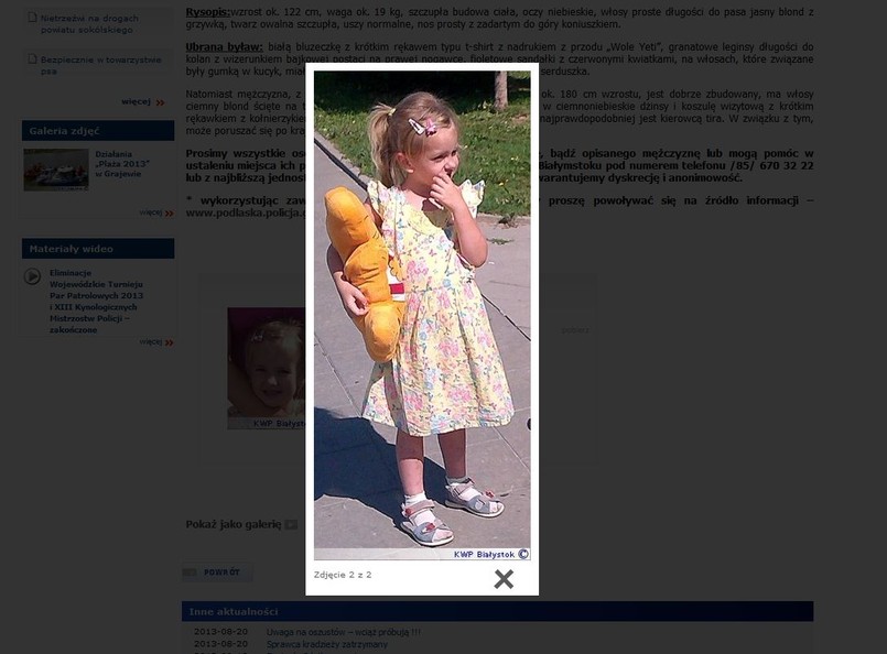 Policja prosi o pomoc w poszukiwaniach dziewczynki i mężczyzny każdego, kto może mieć informacje na temat ich miejsca pobytu. Telefon do komisariatu w Białymstoku: (85) 670 32 22, a w całym kraju 997 lub 112 z telefonu komórkowego.