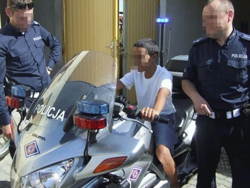 Mali Dominikańczycy mieli okazję poznać pracę polskich policjantów i sprzęt, jakiego używają. Na zdjęciach z tej wizyty widać chłopców siedzących na policyjnym motocyklu.