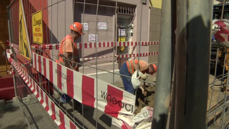 Przed sklepem z dopalaczami przy ulicy Rzgowskiej w Łodzi twa remont chodnika. Zakład Wodociągów i Kanalizacji informuje o zapadlisku przed budynkiem i zapewnia, że prace nie mają nic wspólnego z dopalaczami.