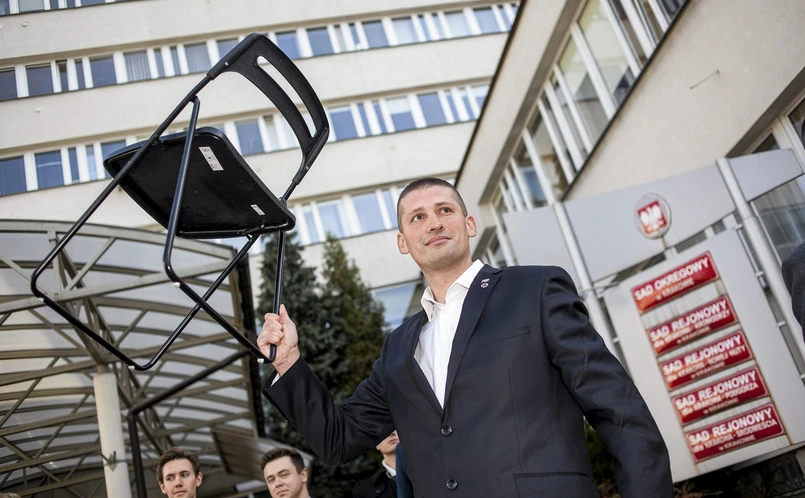 W trakcie procesu oskarżony nie przyznawał się do zarzutów i wyjaśniał, że krzesło było elementem happeningu i miało symbolizować wpadkę dyplomatyczną prezydenta w Japonii. Twierdził, że padł ofiarą prowokacji i podawał się za osobę poszkodowaną przez system. Kiedy sąd ujawnił, że w swoim środowisku podawał się za "Marka Mareckiego", wyjaśnił, że jest to jego pseudonim polityczny. O tym, że "Marecki" to pseudonim polityczny, a nie prawdziwe nazwisko, nie wiedzieli koledzy oskarżonego. Zaraz po zatrzymaniu go zorganizowali akcję "Uwolnić prześladowanego przez reżim więźnia politycznego Marka Mareckiego!".