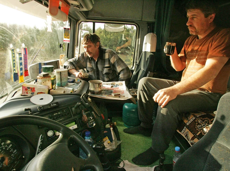 Rekordziści stoją w ogonku od tygodnia. "Śpimy w szoferkach w ubraniach" - opowiada Zenon Struzik w Korczowie. "Na butli gazowej podgrzewamy picie i jedzenie. Oczy myjemy wodą mineralną, no i jesteśmy umyci. Dla rozprostowania kości chodzimy tam i z powrotem wzdłuż samochodu. I tak codziennie".