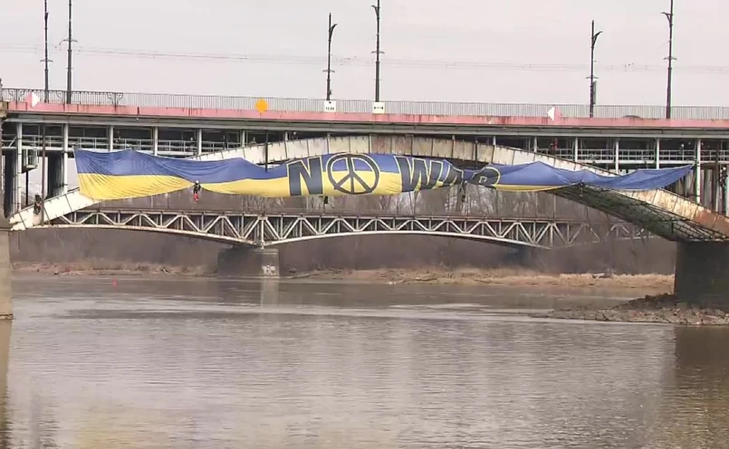 Sześćdziesięciometrowa flaga Ukrainy zawisła na moście Poniatowskiego nad Wisłą w Warszawie. To akcja Greenpeace, która w ten sposób chciała wyrazić swój sprzeciw wobec wojny w Ukrainie.