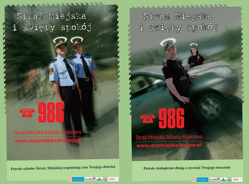 Elementem, który łączy wszystkie plakaty jest aureola, widniejąca nad głowami mundurowych. Bo krakowski strażnik miejski jest jak anioł stróż. Nie tylko dbają o mieszkańców miasta, zapewniając im święty spokój, ale robią to z uśmiechem i poświęceniem. W tej sytuacji nie dziwi nawet, że rzecznikiem prasowym formacji jest Marek Anioł.