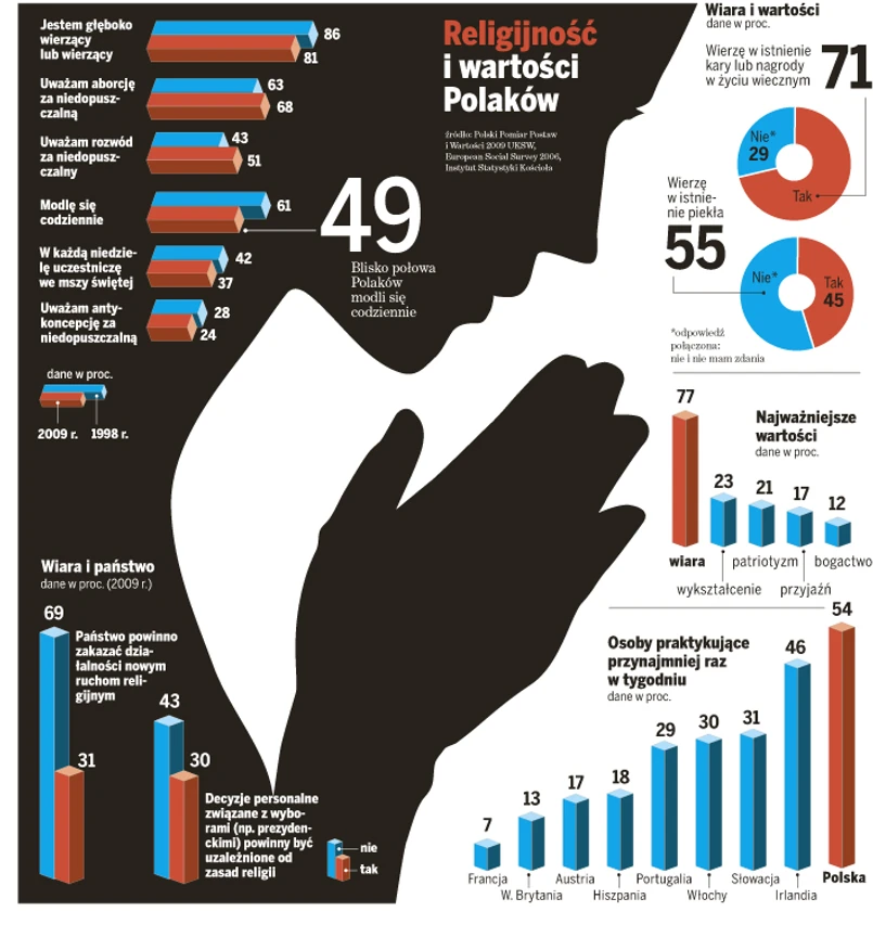 Oprócz wiary Polacy deklarują także przywiązanie do wartości ściśle wynikających z religii. Blisko 82 proc. ankietowanych twierdzi, że ich oceny etyczne kształtowane są przez dekalog. W praktyce jednak to się rozmywa. Bo choć Polacy są przeciwni aborcji - nawet bardziej niż dziesięć lat temu - a także zaostrzyło się ich negatywne podejście do rozwodów, to już do środków antykoncepcyjnych podchodzą dużo bardziej liberalnie. Blisko połowa uważa, że nie ma nic złego w ich stosowaniu.