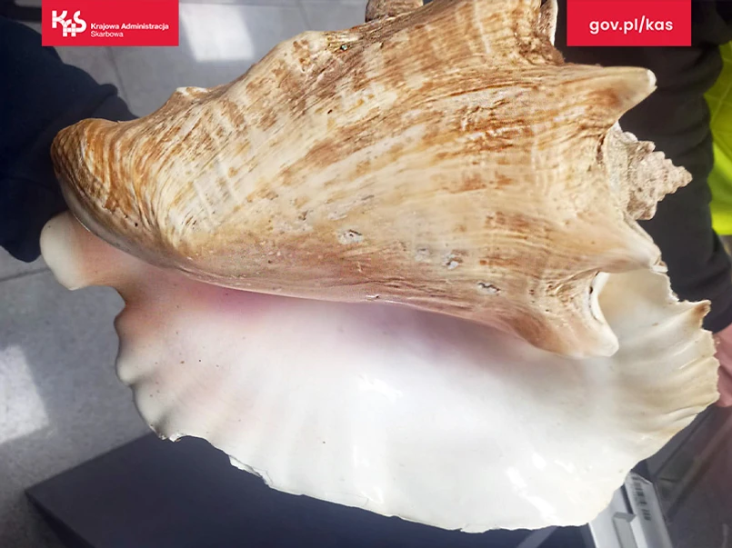 Podróżny, obywatel Ukrainy, przyleciał do Warszawy z Punta Cana (Dominikana) przez Frankfurt. Podczas kontroli, w jego bagażu funkcjonariusze KAS znaleźli 4 muszle skrzydelnika olbrzymiego (Strombus gigas), przewożone bez wymaganego zezwolenia. Największa z muszli miała długość 31 centymetrów.