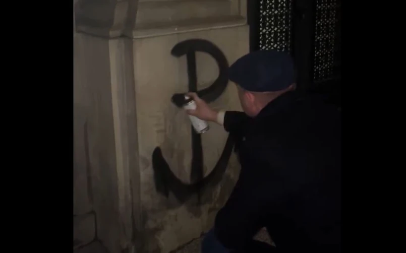 Robert Bąkiewicz zamieścił w serwisie x.com nagranie, na którym widać było, jak maluje symbol Polski Walczącej - przypomina portal. Polityk zareagował w ten sposób na doniesienia o zdjęciu przez kierownictwo resortu klimatu tablic upamiętniających polskich żołnierzy. Ministerstwo tłumaczyło, że tablice zostały zdjęte na czas remontu.