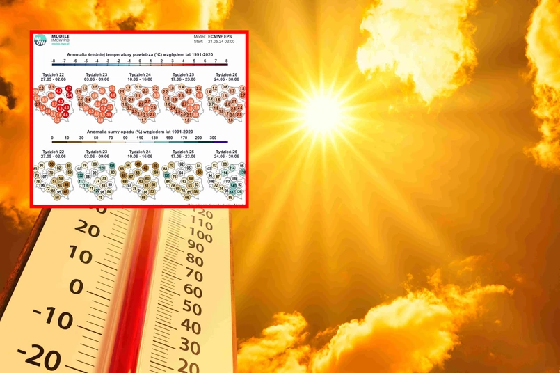 Trzeci tydzień czerwca znów może przynieść ocieplenie. Średnie temperatury będą od 1,4 do 3,3 stopni powyżej normy. Wzrost temperatury najmniej odczuwalny będzie nad morzem, a najbardziej na Podlasiu, Podkarpaciu, Lubelszczyźnie i w centralnych regionach kraju. Suma opadów wyniesie od 50 proc. normy na Podlasiu do 131 proc. w woj. lubuskim.