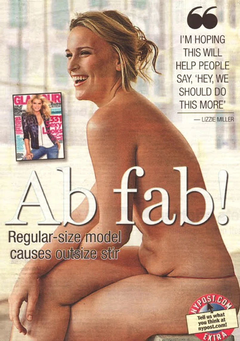 Sprawczyni całego zamieszania, Lizzie Miller, jest dumna ze swojej fałdki tłuszczu. W macierzystej agencji usłyszała wręcz, że nie wolno jej schudnąć. Trudno się dziwić, bo pracuje dla nowojorskiej Wilhelminy, jednej z największych na amerykańskim rynku agencji, specjalizującej się w modelkach tzw. size plus. W branży mody, która stoi modelkami noszącymi rozmiary 30 do 34, tak określa się dziewczyny noszące większe rozmiary, najlepiej powyżej 40.