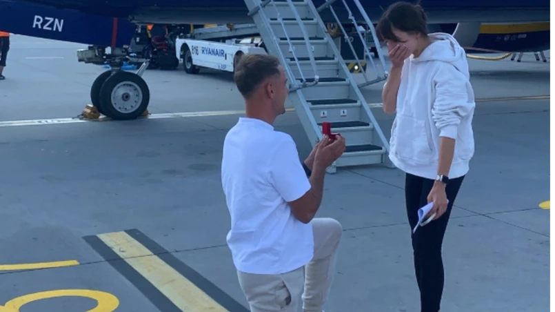 Mężczyzna o imieniu Sylwester oświadczył się swojej ukochanej Aleksandrze na płycie lotniska, co zostało uwiecznione na zdjęciach i opublikowane w mediach społecznościowych przez pracowników lotniska.