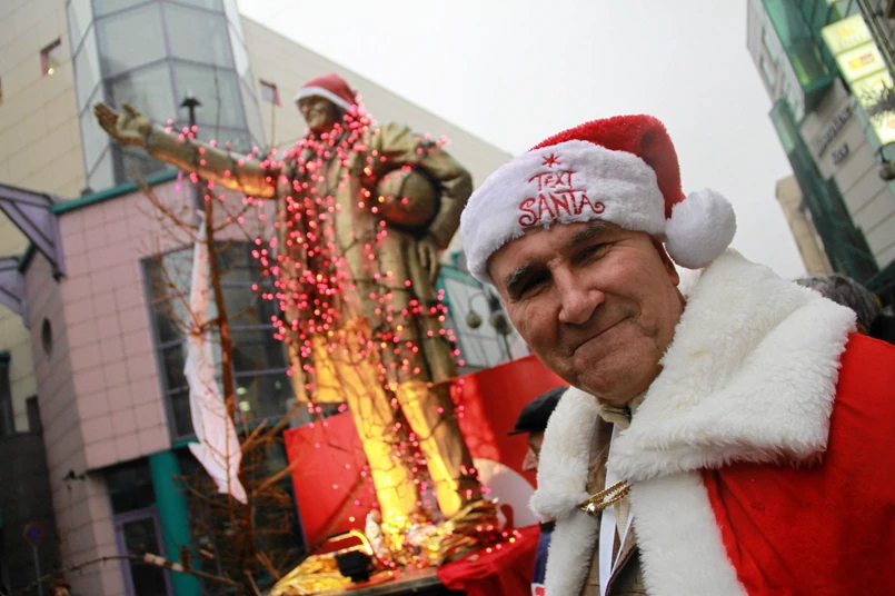 3 Pomnik premiera został wyposażony w świąteczne dekoracje. Oprócz czerwonej czapki związkowcy zainstalowali na nim choinkowe lampki