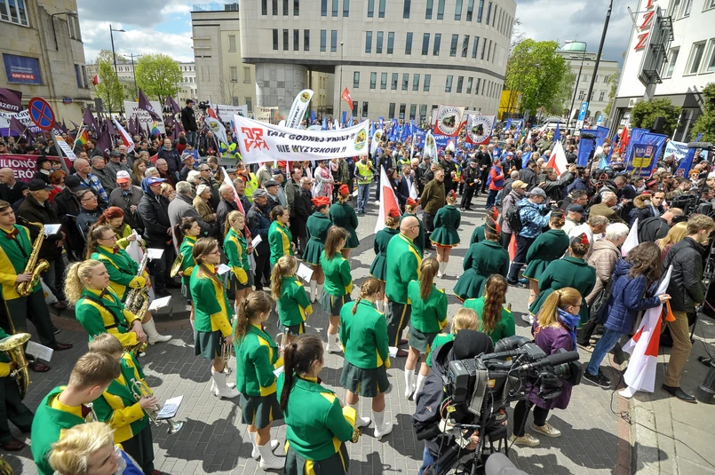 Mażoretki, Młodzieżowa Orkiestra Dęta, górnicy, OPZZ i SLD. Święto Pracy w Warszawie pod hasłem "Przywróćmy godną pracę"