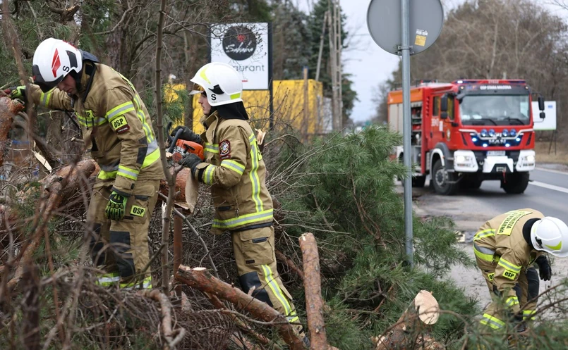 1/6 Strażacy usuwają powalone przez wichurę drzewa w warszawskiej Falenicy